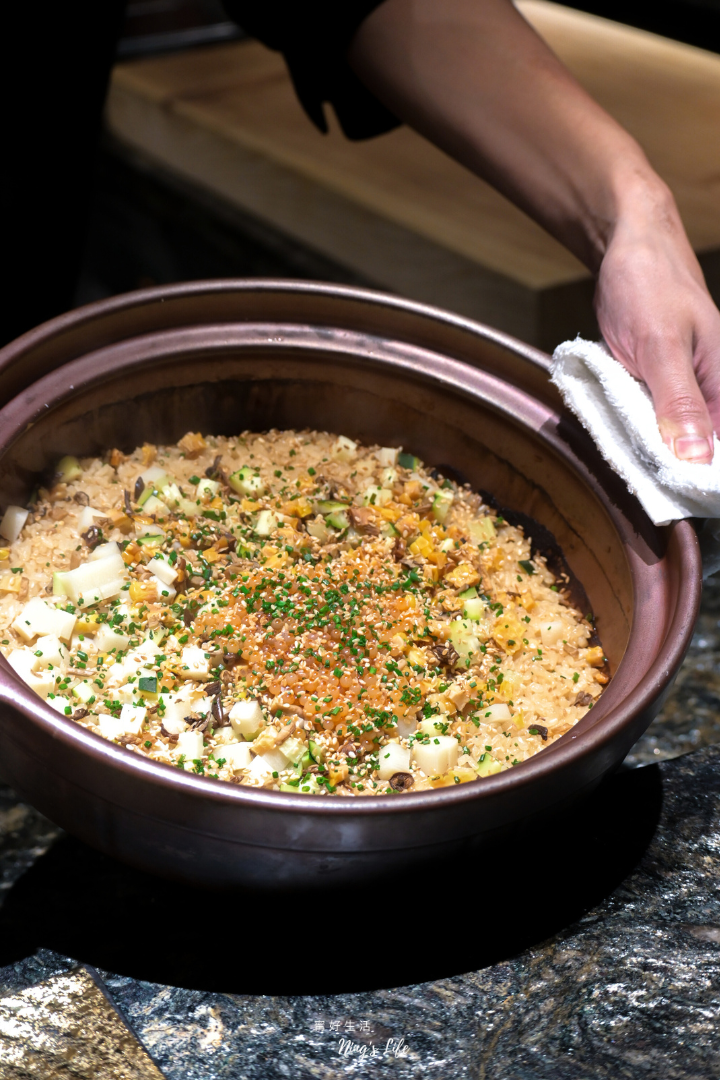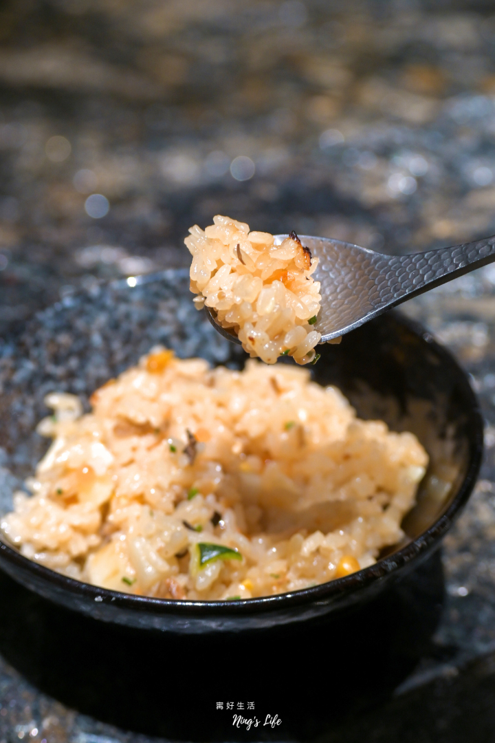▲ 土鍋炊飯加入玉米、櫛瓜、茭白筍等食材,撒上鮭魚卵與蔥花,炊飯米粒吸飽湯汁,口感偏濕軟,第一次吃到放玉米的炊飯,如果有小孩,大概會吃得很開心呢