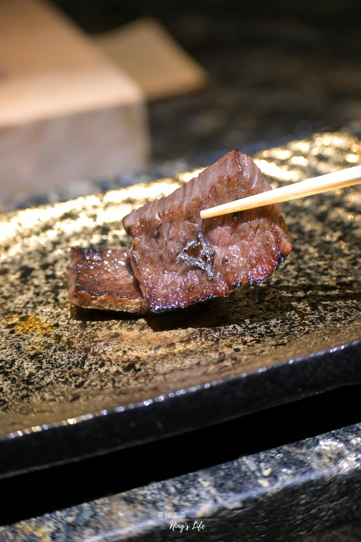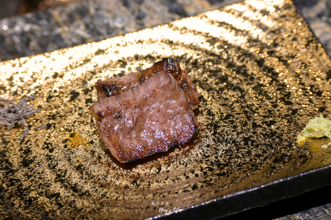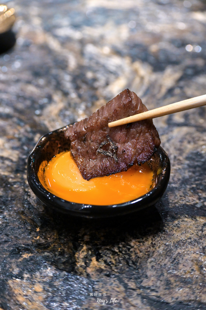 ▲ 和牛外腹脅肉以直火燒烤逼出油脂香氣,多了幾分豪邁感,一樣可沾蛋液享用