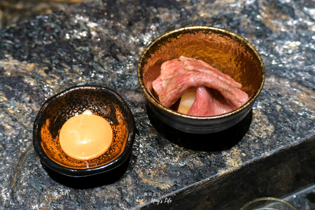 ▲ 大片和牛紐約客有厚度,以壽喜燒方式呈現,大約五分熟度,脂香豐潤,可沾蛋黃享用