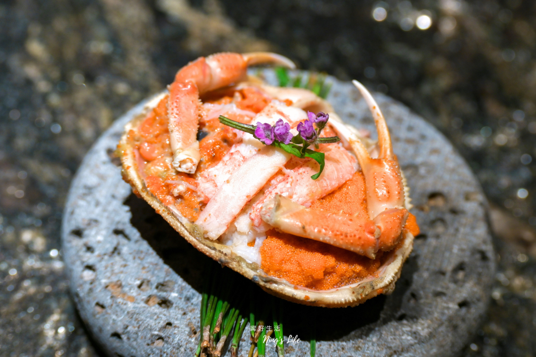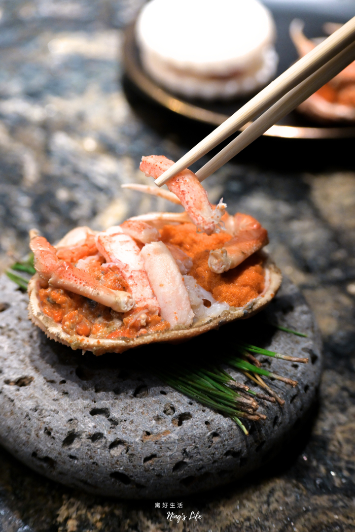 ▲ 今日最喜歡的料理莫過於香箱蟹!橘紅蟹殼晶亮飽滿,蟹肉細密若絲、帶著海水甜,入口時,外子顆粒在舌尖輕輕綻放,像小小爆裂的浪,內子濃郁則緩慢堆疊,如冬日海灣的深沉暖意。蟹肉本身清澈、溫雅,帶著只有初冬才能擁有的細緻鮮甜