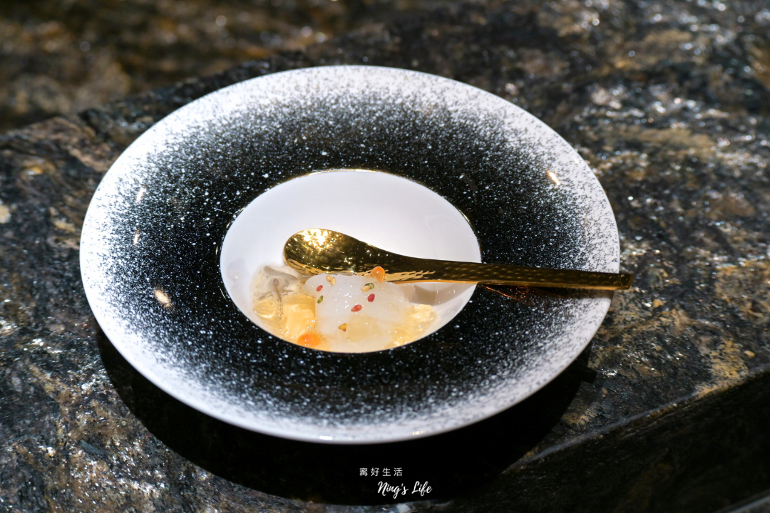 ▲ 薄切軟絲細緻脆彈,與清爽醋凍交融,點綴五色芝麻,酸香涼韻讓味蕾瞬間被喚醒