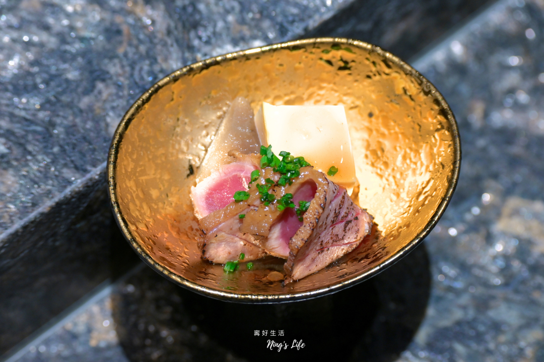 ▲ 前菜鴨胸治部煮粉嫩帶彈性,清甜肉汁在口中綻開,搭配冷奴豆腐滑嫩如絲,與浸滿甘醇高湯的軟糯茄子相互襯托,是溫柔沉靜的一道開場