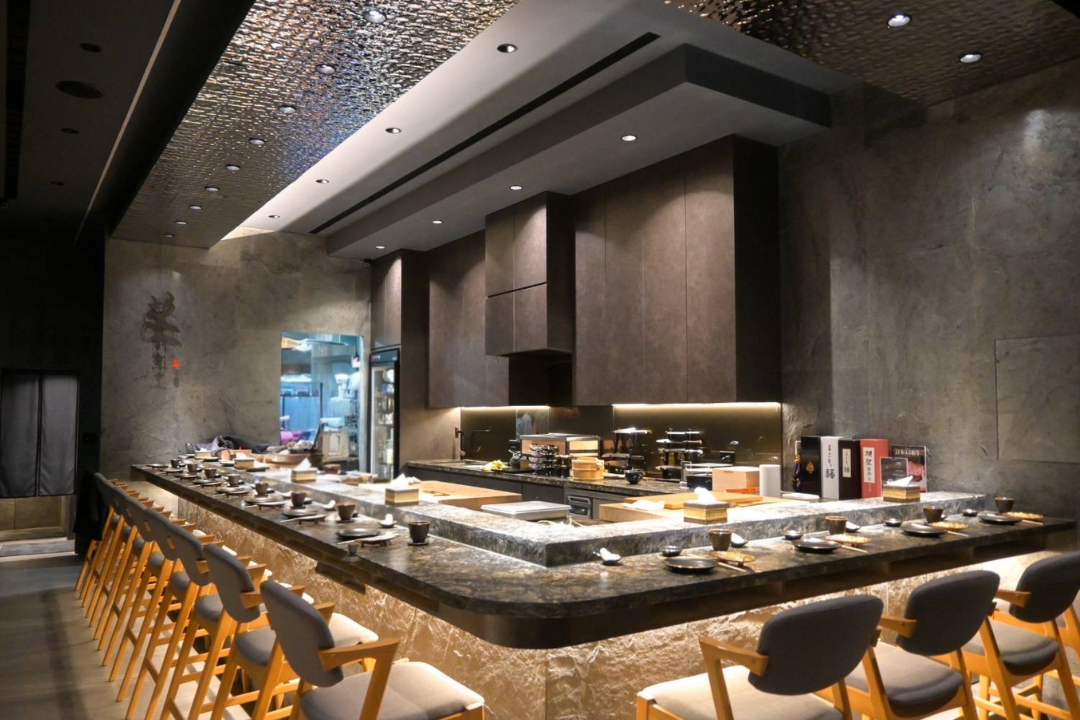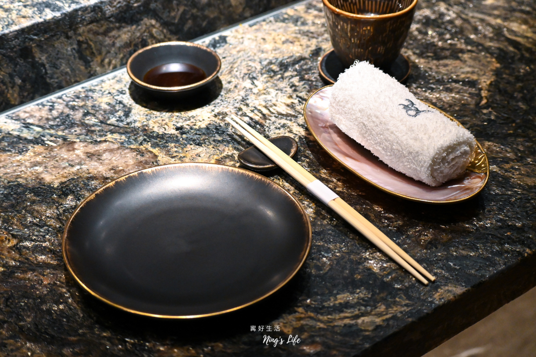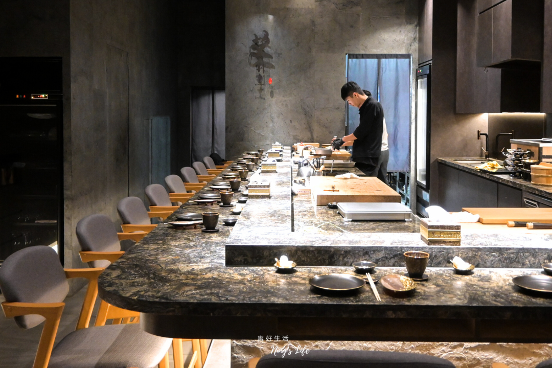 ▲ 走進空間,深色石牆與金屬質感天花,共同堆疊接近夜色的沈穩氣場,柔和地落在檯面與器皿上,像是在為每一道料理預留舞台焦點。大片石質吧檯如同靜靜流動的岩層,觸感冷冽卻沉穩,襯托木質座椅溫度,使空間在冷與暖之間取得完美平衡