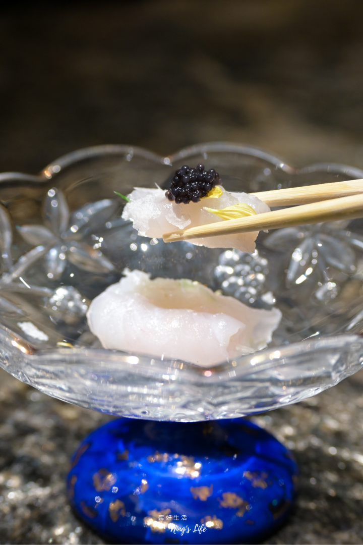 ▲ 薄切剝皮魚捲入爽脆黃瓜,清新雅致,第一口直接品嚐魚肉的純淨甜味,第二口沾醬油,旨味被完美拉伸,淡雪鹽與花香輕落,如初雪般纖細