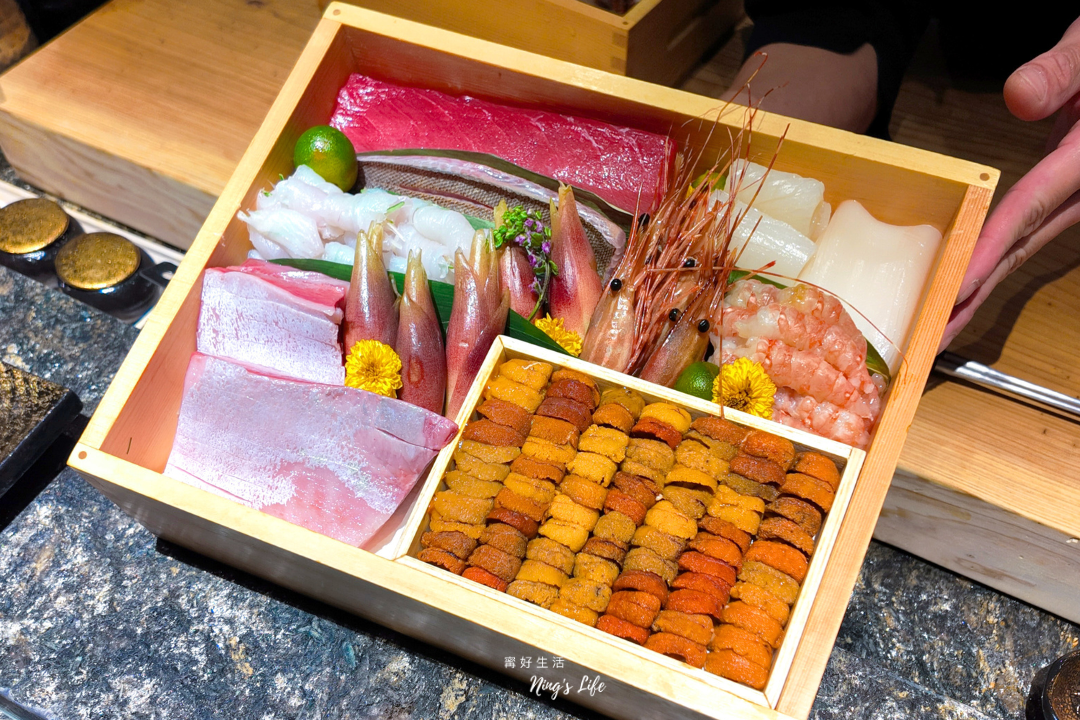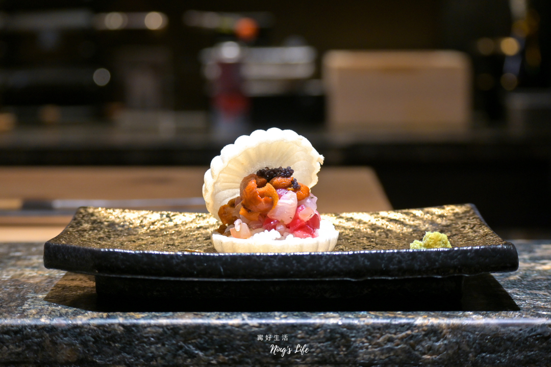 ▲ 海鮮珠寶最中是一道創意料理,在最中餅中堆疊米飯、當季魚肉、馬糞海膽、晶透魚子醬、鮭魚卵,口味可以想像成精緻版、濃縮版散壽司,也是 IG 打卡的熱門料理