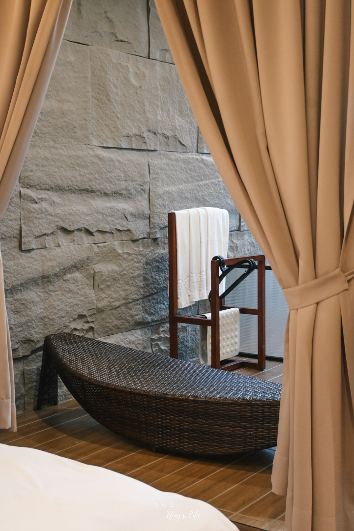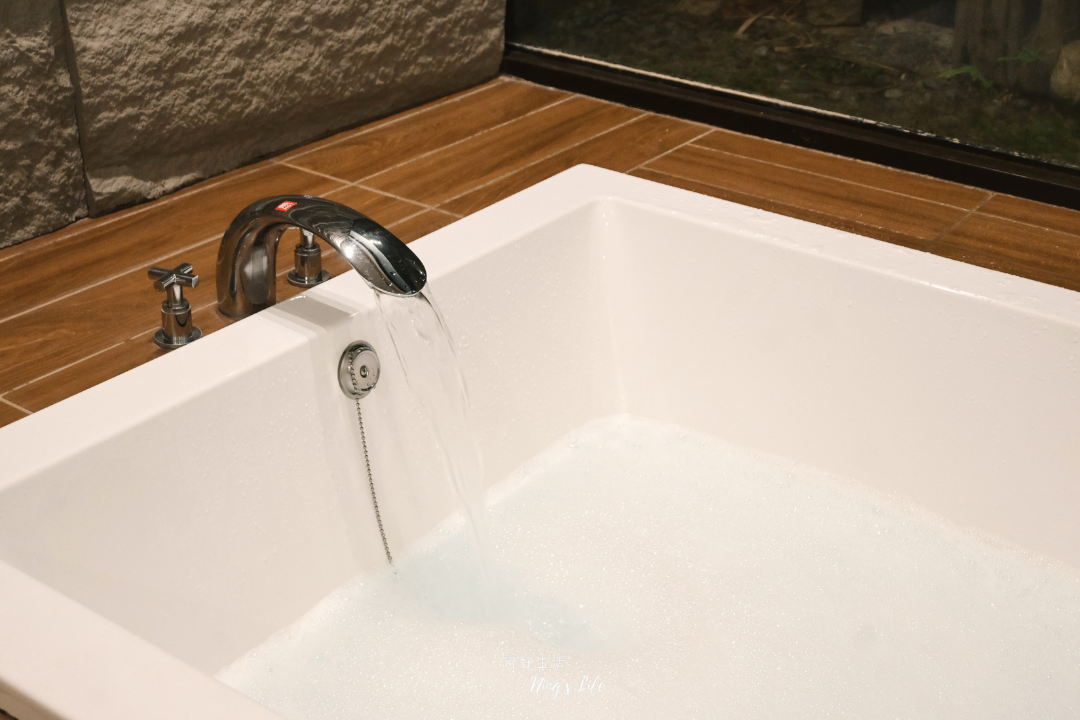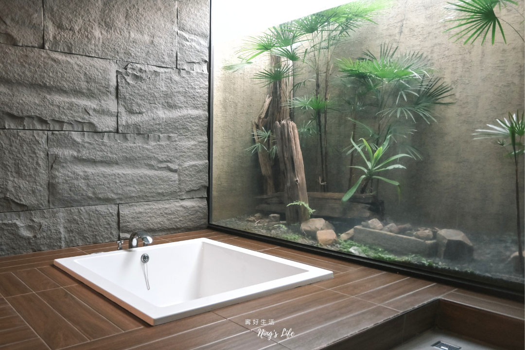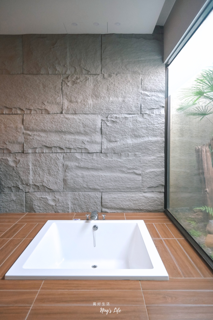 ▲ 浴室空間大,以石牆、綠植造景打造自然風格,規劃淋浴和大浴缸,也有提供沐浴劑