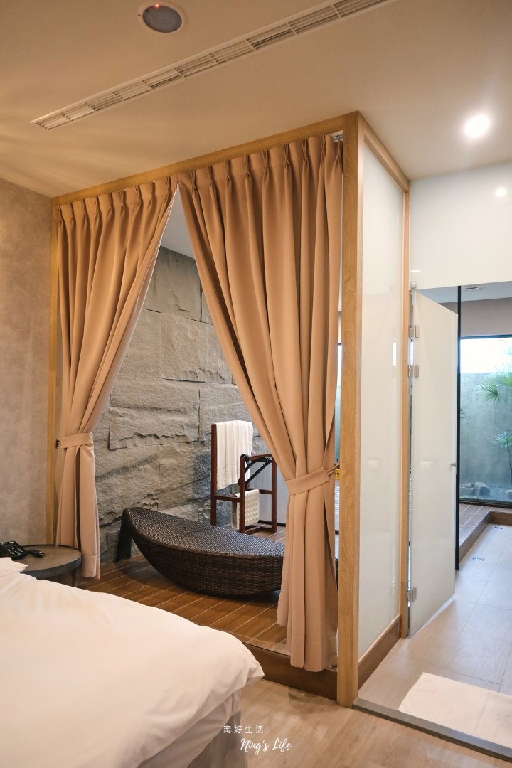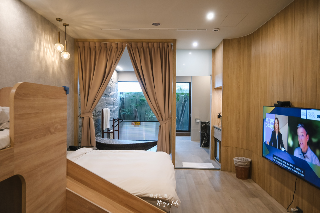 ▲ 一進門就發出「哇」的驚嘆,溜滑梯房實在太好玩了!房間以木淺色為主色調,呈現溫馨氛圍,空間分成前後兩區:前區臥室包含一大床、兩小床、溜滑梯、小茶几、mini bar 與冰箱;後區是衛浴廁所空間,有大浴缸、淋浴設備和陽台造景,以窗簾和門做區隔,睡覺時也不怕溢光。整體來說房間算是乾淨整潔、沒有異味,讓人住得安心放心,很適合一家大小來