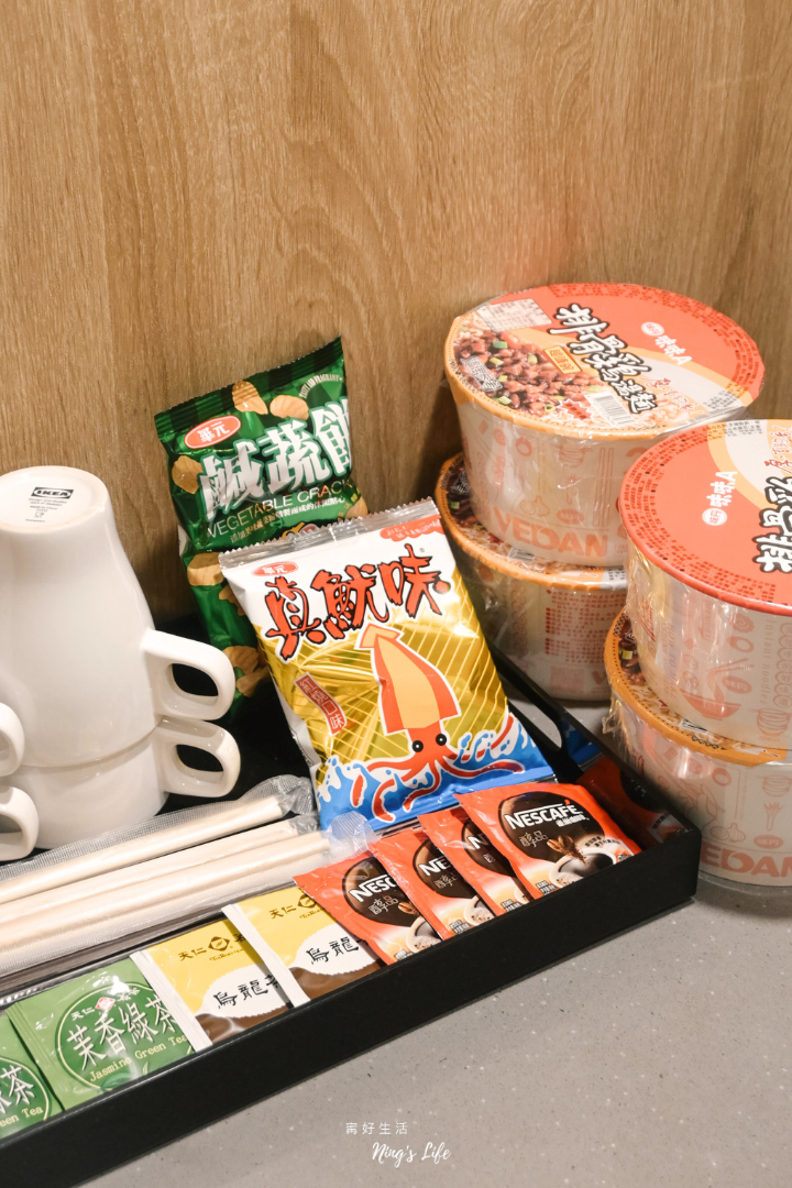 ▲ 雖然沒有供餐,但提供咖啡、茶包、餅乾和泡麵,冰箱中還有四瓶水,格外貼心,不怕餓肚子!早餐可以選擇前一天買好放冰箱,或到隔壁吃小籠包